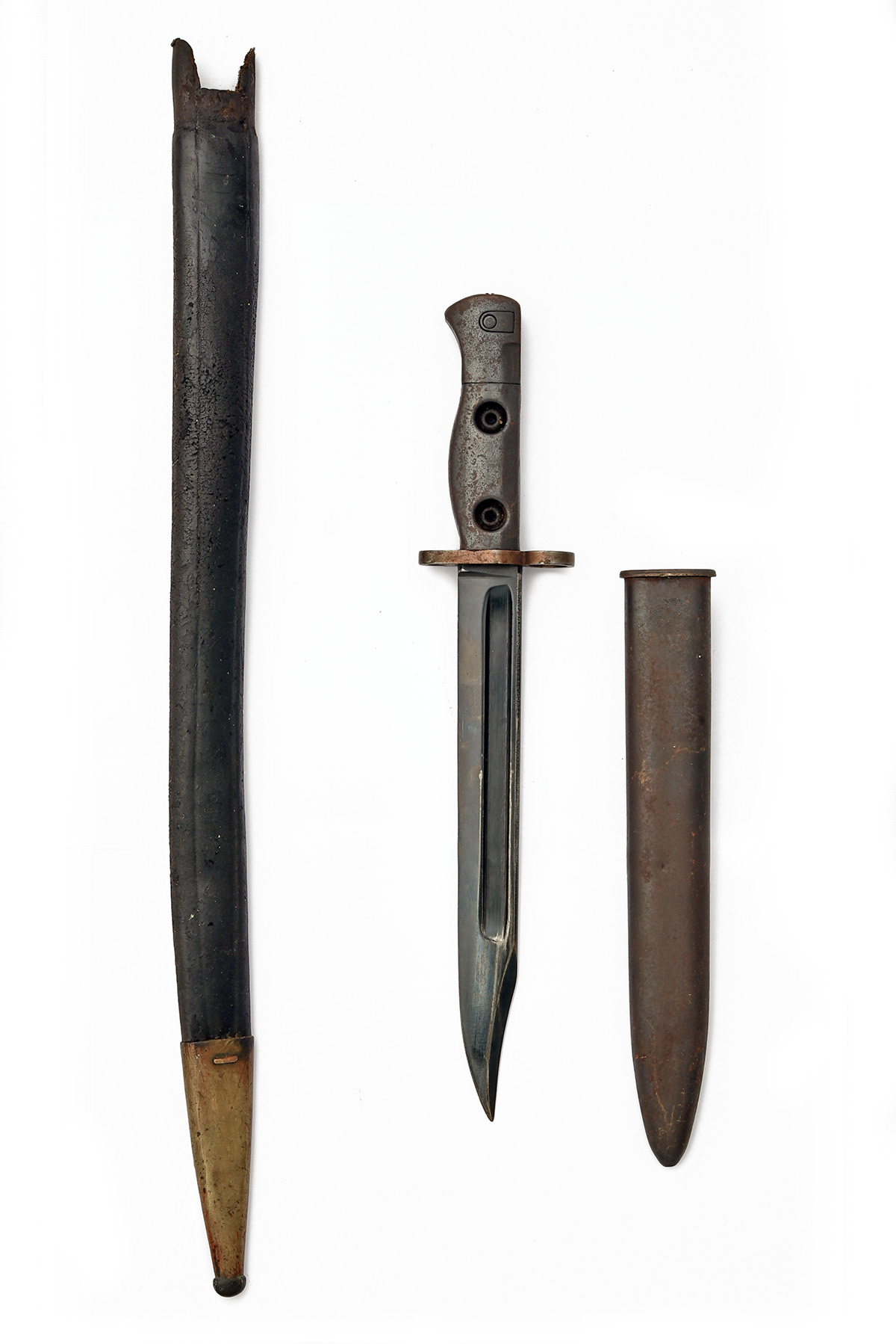 A BAYONET FOR THE L1A1 SLR, AN UNUSUAL 'BAYONET', AND A CONTINENTAL SCABBARD. 1) circa 1960s single-edged clipped point 8 in. blade fullered on each side, ricasso marked 'B60' together with its steel scabbard, 12 1/4 in. overall; 2) superficially similar to a P1856 Yataghan sword bayonet, with a 22 1/2 in. single-edged curved blade fullered on each side, ricasso with Weyersburg trademark on one side and Broad Arrow, 'WD' and inspection mark over, steel hilt with pressed leather grips, worn, blade painted black, heavy losses to grips, release button missing but most noticeable is that the blade curve cuts across the line of sight of the barrel - possibly a marriage to make a trench weapon? 27 1/2 in. overall; 3) a black leather scabbard with brass chape, missing its locket, 18 in.