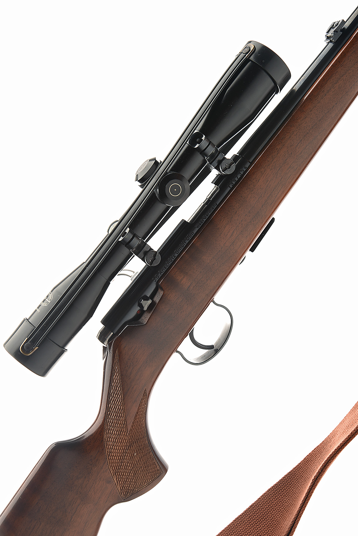 LEFT-HANDED ANSCHUTZ .22 LR 'MODELL 1415 - 1416' BOLT-MAGAZINE SPORTING RIFLE, serial no. 1397354, dated 1993, 22 1/2in. nitro barrel threaded for a sound moderator, ramp-mounted bead fore-sight, rear open sights, received fitted with a Schmidt & Bender 4x36 telescopic sight, serial no. 33972, detachable magazine (with spare), pistolgrip stock with canvas sling, 14in. pull