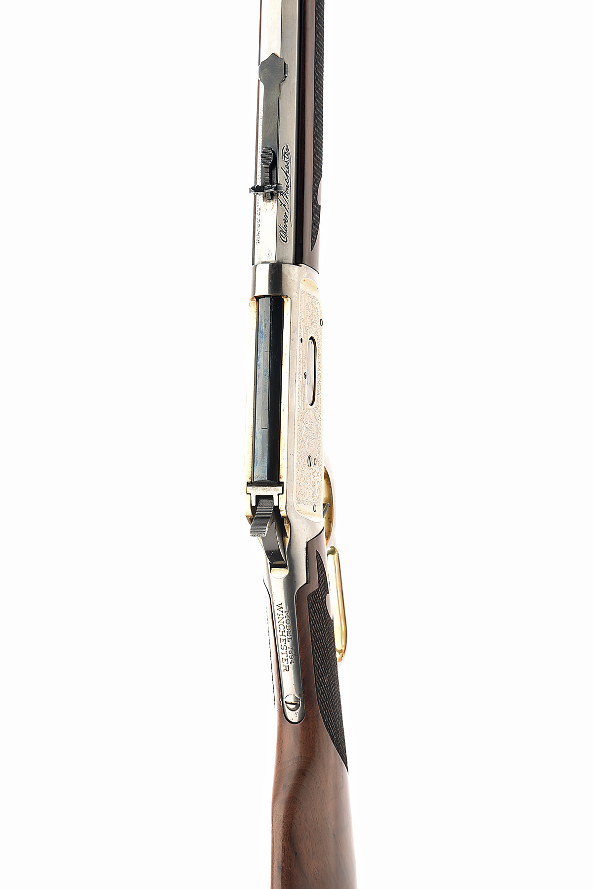 WINCHESTER .38-55 'MODEL 1894 OLIVER F. WINCHESTER' COMMEMORATIVE LEVER-ACTION REPEATING RIFLE, serial no. OFW768, 24in. octagonal sighted barrel with 'Oliver F. Winchester' signature in gold lettering towards the breech, gold-plated action engraved with scrollwork framing panels including hunters, Winchester himself and the factory complex, 13in. figured stock with chequered grip and fore-end, the right side of the butt inset with a gold-plated medallion