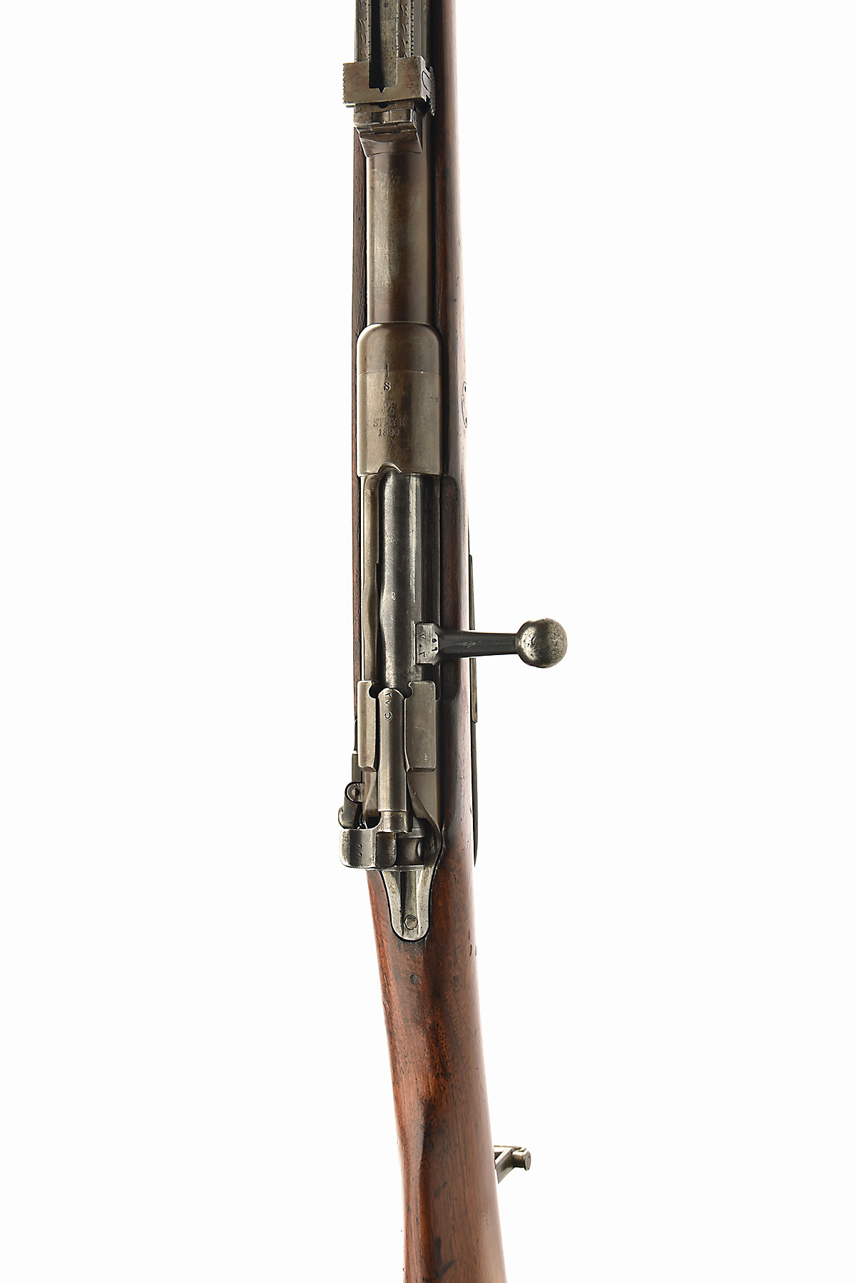 STEYR 8X57mm (IS) 'MODEL 1888 COMMISSION / GEWEHR 88/05' BOLT-MAGAZINE SERVICE RIFLE, serial no. 1754 W, dated 1890, 30in. nitro reproved shrouded barrel (in 2024), block and blade fore-sight, elevating ladder rear sight in Farsi script, receiver marked 'S', and 'W.G. STEYR 1890.', receiver with slight thumb cut-out and stripper clip guide, the left side marked 'GEW. 88', straight bolt handle, full-length stock with two barrel bands, sling swivels, 13in. pull including steel buttplate, weight 8lb. 10oz.