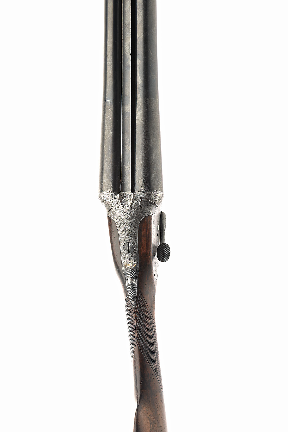 STEPHEN GRANT 12-BORE SIDELEVER SIDELOCK EJECTOR, serial no. 5844, for 1887, 28 1/8in. sleeved nitro barrels, 2 1/2in. chambers, bored approx. 1/4 and 3/4 choke, distortion to under rib, fluted leaf fences, automatic safety with gold-inlaid 'SAFE' detail, removable striker discs, fine acanthus scroll engraving (worn, scattered areas of pitting), tapped hole to rear of triggerguard, 14 7/8in. figured stock (slightly cast on for the left shoulder) including 3/4in. wooden extension and buttplate, damage and repair to fore-end wood, weight 6lb. 15oz.