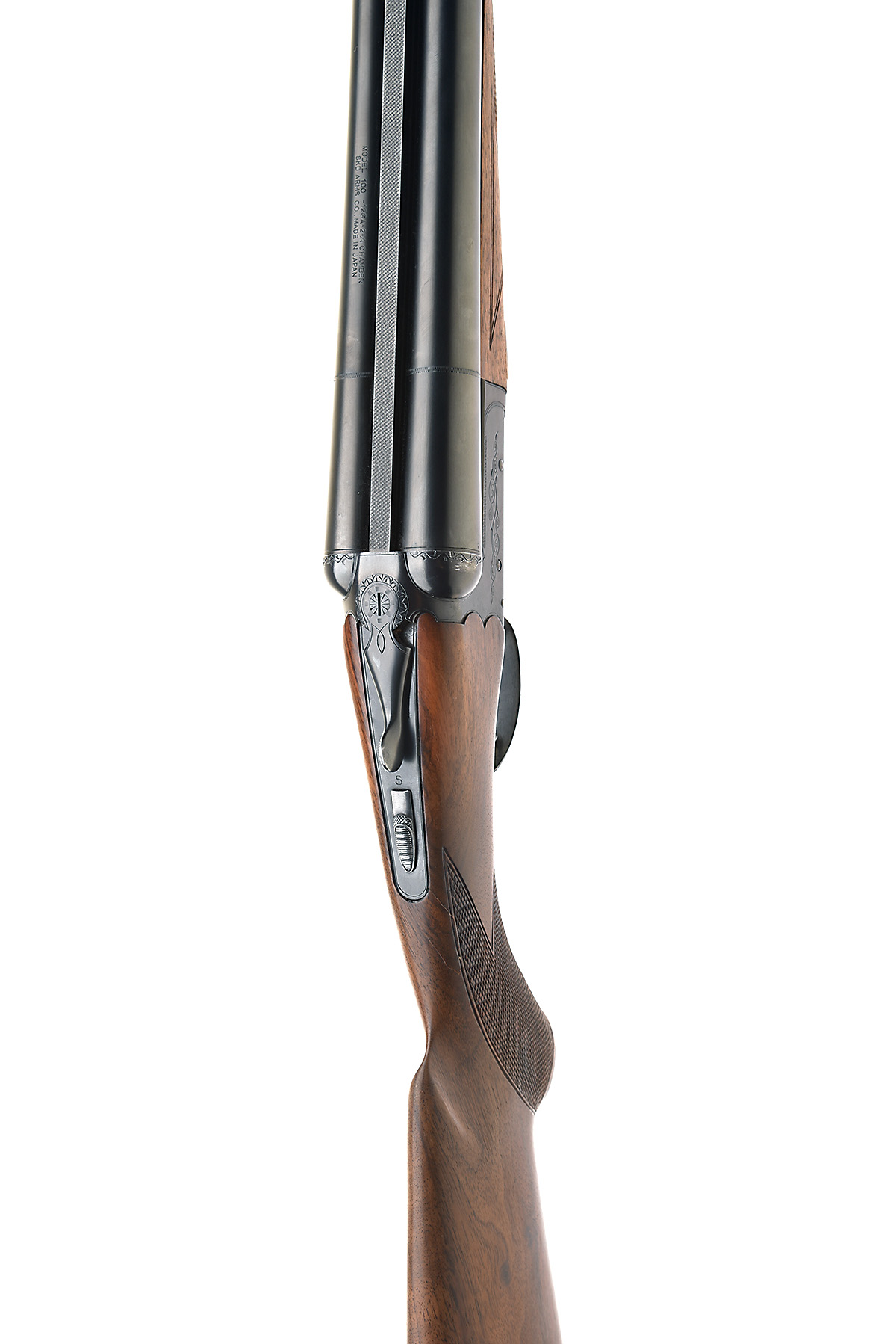 SKB 12-BORE 'MODEL 100' SINGLE-TRIGGER BOXLOCK NON-EJECTOR, serial no. S5119307, circa 1975, 28in. nitro barrels, 2 3/4in. chambers, bored approx. imp. cyl. and 1/2 choke, scroll-back action, automatic safety, partial scroll engraving, blacked finish, 14 1/4in. pistolgrip stock including buttplate