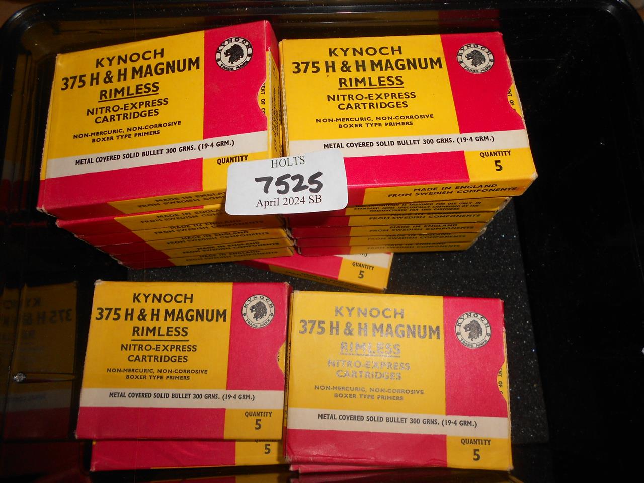 ONE HUNDRED ROUNDS OF VINTAGE AND COLLECTABLE .375 H&H MAGNUM RIMLESS NITRO-EXPRESS BIG GAME RIFLE AMMUNITION BY KYNOCH in factory 10 round "brick" packets. Listing the use of non-corrosive boxer priming and 300 grain solid full jacket bullets, batch no. 14 M U, in an ABS travel case