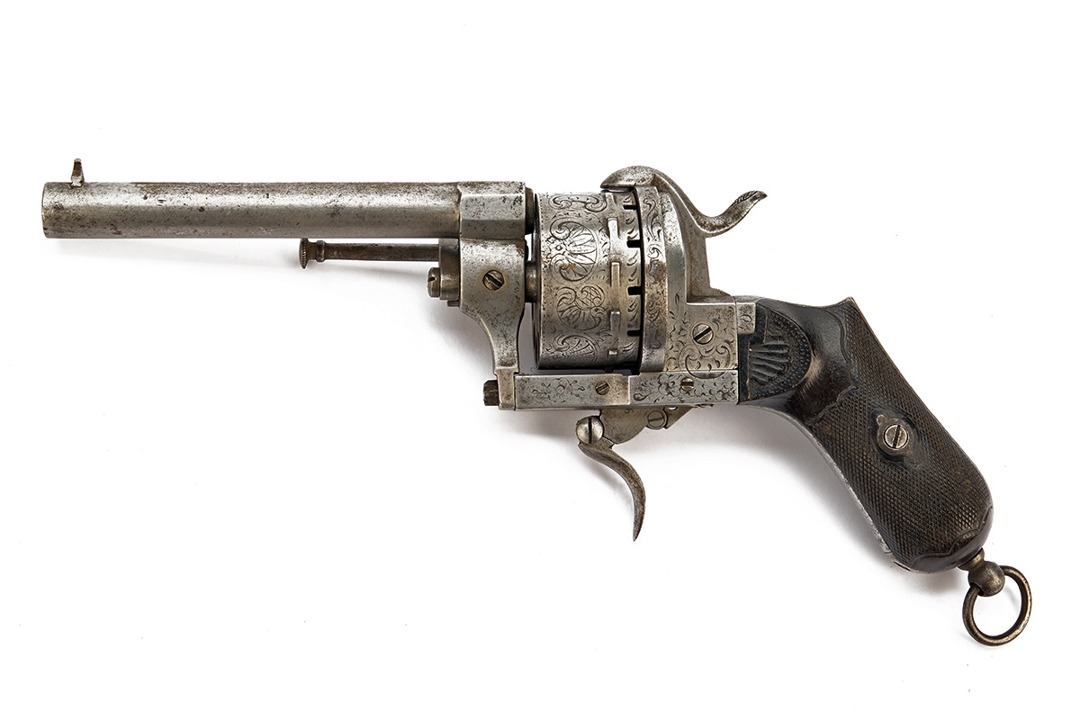 AN UNUSUAL SPANISH 7mm DOUBLE-ACTION 12-SHOT PINFIRE REVOLVER, SIGNED 'REAL PRIBILEGIO', no visible serial number, circa 1860, with 4 3/4 in. round to octagonal sighted barrel signed 'Rl. PRIBILEGIO – VERGARA Y CA – EIBAR', engraved cylinder and frame, stepped handle with chequered wooden grips, lanyard ring, hinged trigger, side-mounted ejector rod, hinged loading gate, worn and stained, engraving rubbed, overall length 9 1/2 in.