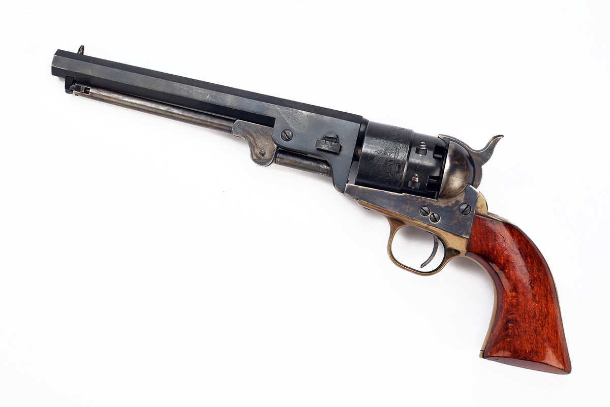A REPRODUCTION .44 PERCUSSION COLT-TYPE REVOLVER, serial no. 43151, Italian, with blued octagonal 7 1/2in. barrel, blued stepped cylinder, open colour hardened frame and smooth walnut grip