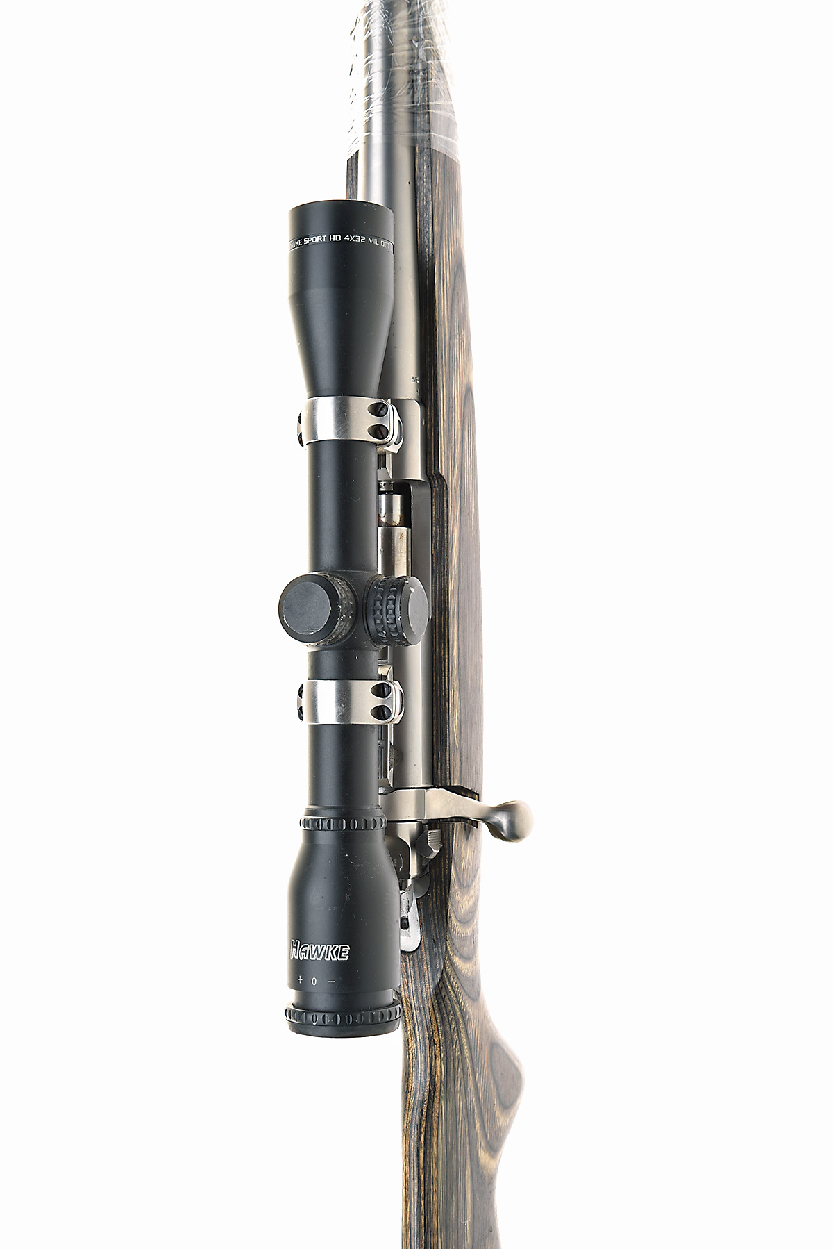 A MODERN .50 PERCUSSION SINGLE-SHOT BOLT-ACTION MUZZLE-LOADING RIFLE SIGNED RUGER, MODEL '77/50', serial no. 730-08582, circa 1998, 22in. barrel, bead fore-sight, folding leaf rear-sight, fitted with a Hawke 4x32 telescopic sight, manual safety, laminated pistolgrip stock with cheekpiece, sling eyes