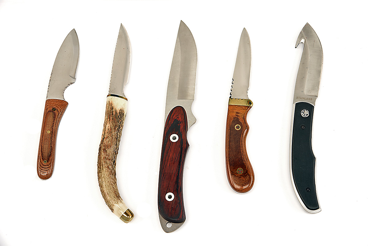 A COLLECTION OF FIVE FIXED-BLADE SMALLER SPORTING KNIVES, various manufacturers, the largest 8in. overall, all with sheaths