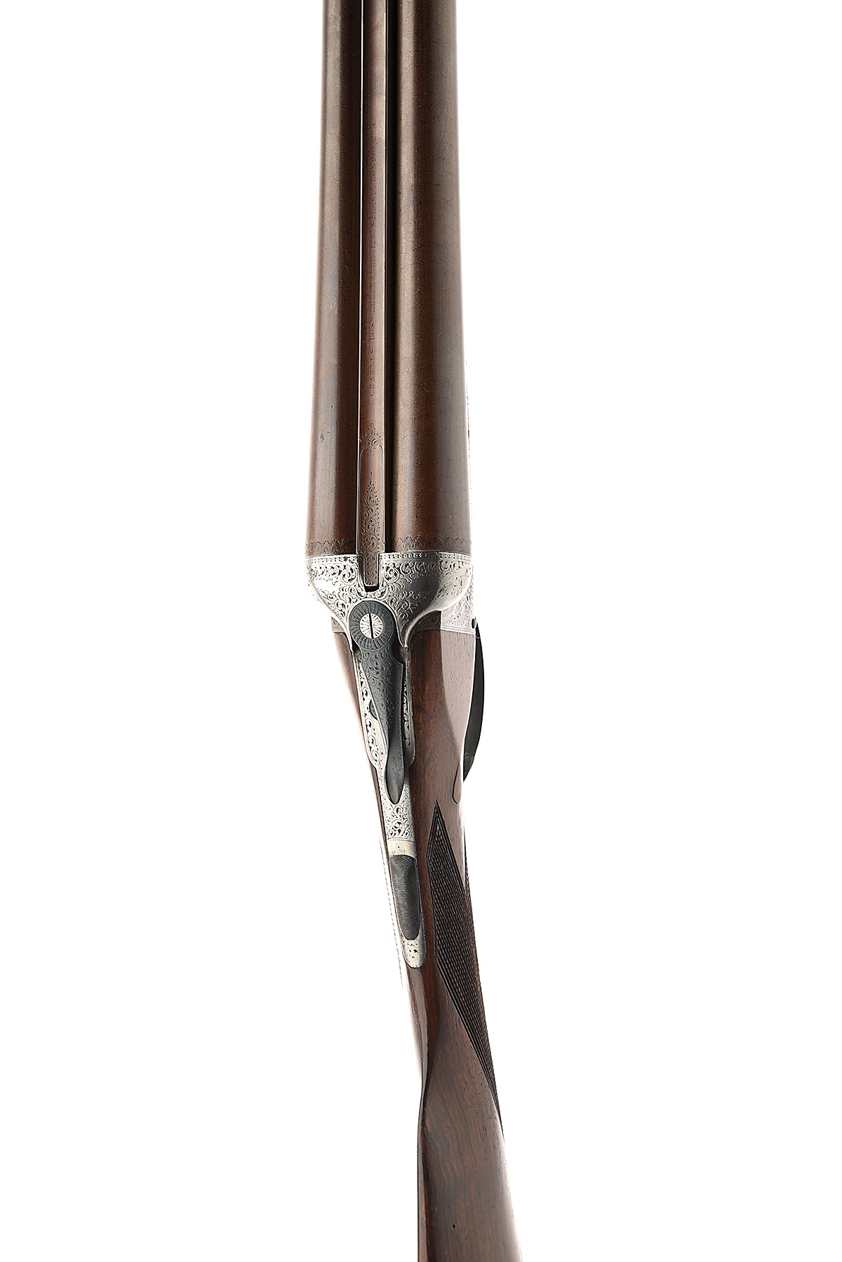 CHARLES BOSWELL 12-BORE BOXLOCK NON-EJECTOR, serial no. 13485, for 1898, 30in. nitro reproved (in 1993) damascus barrels (some pits and dents), the rib engraved 'CHARLES BOSWELL. MAKER. 126. STRAND. LONDON. W.C.', and with acanthus scroll detailing at the breech-end, 2 1/2in. chambers, bored approx. imp. cyl. and 3/4 choke, (left wall at 16 thou), treble-grip action, automatic safety with gold-inlaid 'SAFE' detail, border and acanthus scroll engraving the makers name in a scrolling banner, brushed bright and reblued finish overall, 14in. figured replacement stock, weight 6lb. 4oz.