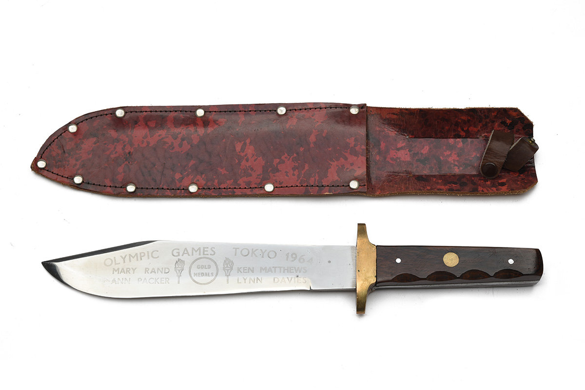 A SPORTING SHEATH KNIFE AND A VINTAGE STYLE BOWIE MARKED TO THE 1964 OLYMPICS, the first with fullered 8in. blade and finger-spurred horn grip with brass furniture, the second of vintage style with wood finger scalloped grips, the 9 1/2in. blade etched 'OLYMPIC GAMES TOKYO 1964' together with 'MARY RAND', 'ANN PACKER', 'KEN MATTHEWS' and 'LYNN DAVIES' flanking two Olympic torches either side of a circle around the wording 'GOLD MEDALS', both with scabbards