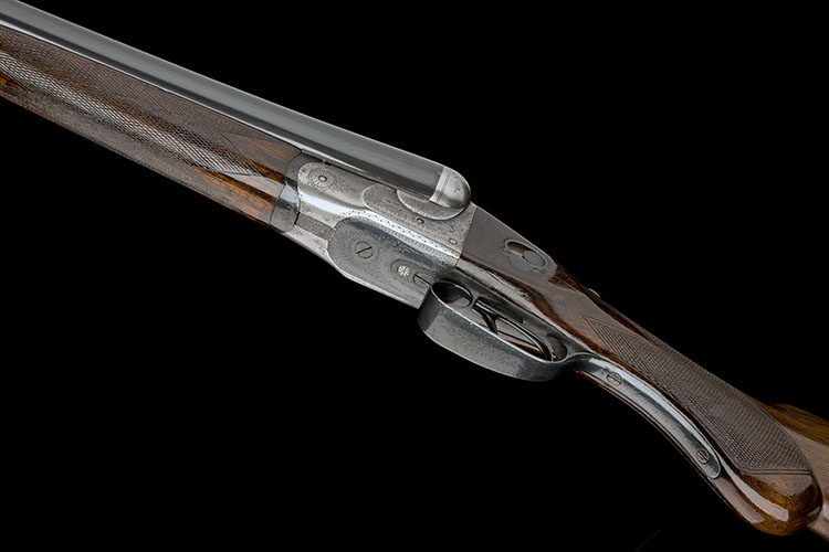 W.W. GREENER AN UNUSUAL 12-BORE BOXLOCK EJECTOR, serial no. 45335, 30in. nitro reproved Greener trade mark barrels, rib engraved 'W.W. GREENER. 68 HAYMARKET. LONDON.' and '2', 2 1/2in. chambers, bored approx. 1/4 choke in both, treble-grip action with short side bolsters, manual side safety, border and acanthus scroll engraving, retaining very slight traces of original colour-hardening, 14 1/2in. semi-pistolgrip stock, weight 6lb. 12oz.