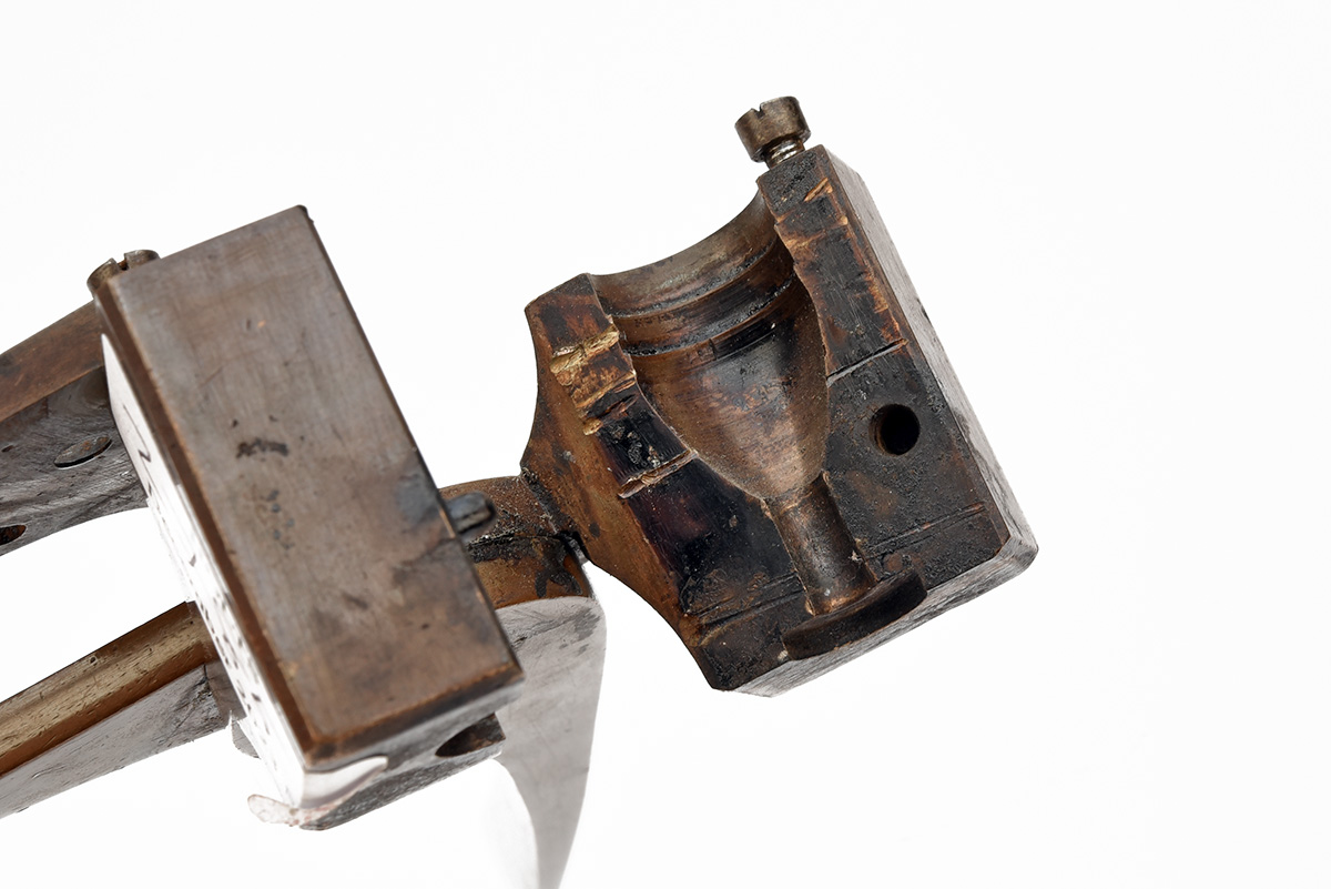 A RARE 14-BORE BULLET-MOULD, mid-1870s, brass with steel sprue-cutter, serial numbered 4632, missing base plunger
