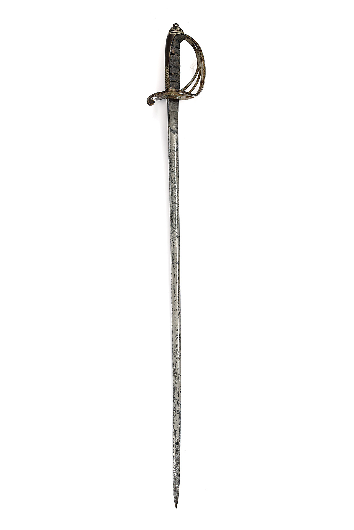 A PATTERN 1827 ARTILLERY OFFICER'S DRESS SWORD FROM THE CHESHIRE & CARNARVON ARTILLERY VOLUNTEERS, late 19th Century, with 30 3/4 in. single-edged blade fullered on each side, etched with scroll-work and artillery symbols, plus unit details to one side and monogram ricasso marked 'HOBSON / & SONS / LITTLE / WIND MILL St / LONDON', with proved plug over, 3-barred guard, wire-bound fish-skin grip, together with its steel scabbard. worn, all metalwork tarnished, scabbard dented, losses to grip wire, this unit existed from 1880 to 1902, 39 in. overall