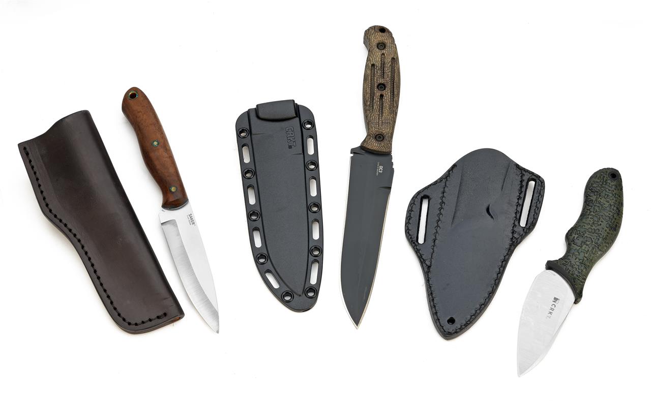 FOUR BOXED CRKT SHEATH-KNIVES, including a Mah-Chete, a Saker Bushcraft (some storage staining), an OC3 Fixed Blade and a Ken Onion Skinner, all apparenty unused in their manufacturers card cartons with scabbards