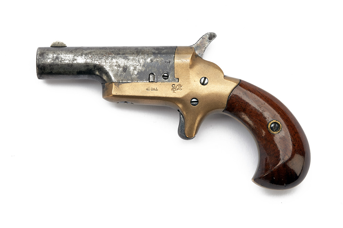 A .41 RIMFIRE COLT THUER-PATENT No.3 DERRINGER VEST-PISTOL, no visible serial number, with 2in. barrel, London roofs, steel barrel with open brass frame (marked with the stallion trademark below 'C') and smooth walnut birdshead grips