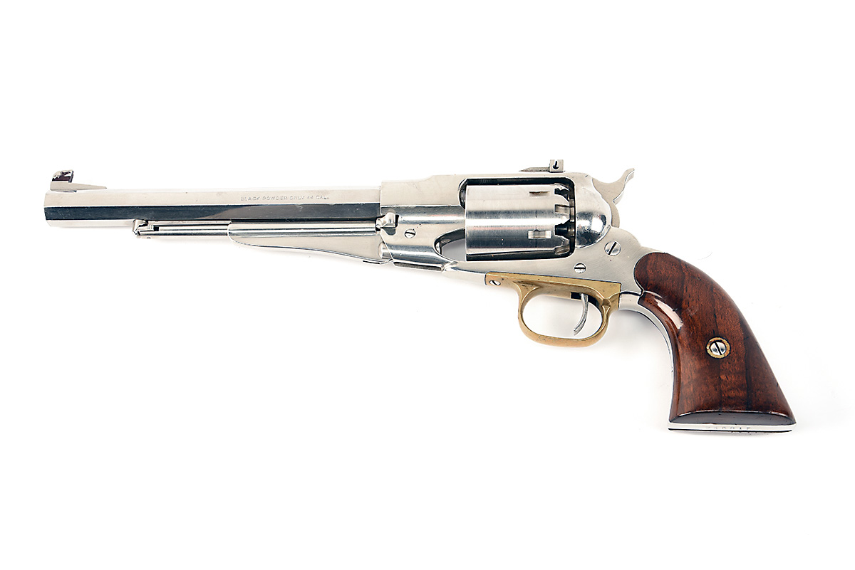 A REPRODUCTION PIETTA STAINLESS REMINGTON ARMY .44 PERCUSSION REVOLVER, serial no. 246817, with octagonal 8in. barrel, adjustable sights, plain cylinder, solid frame and smooth walnut grips