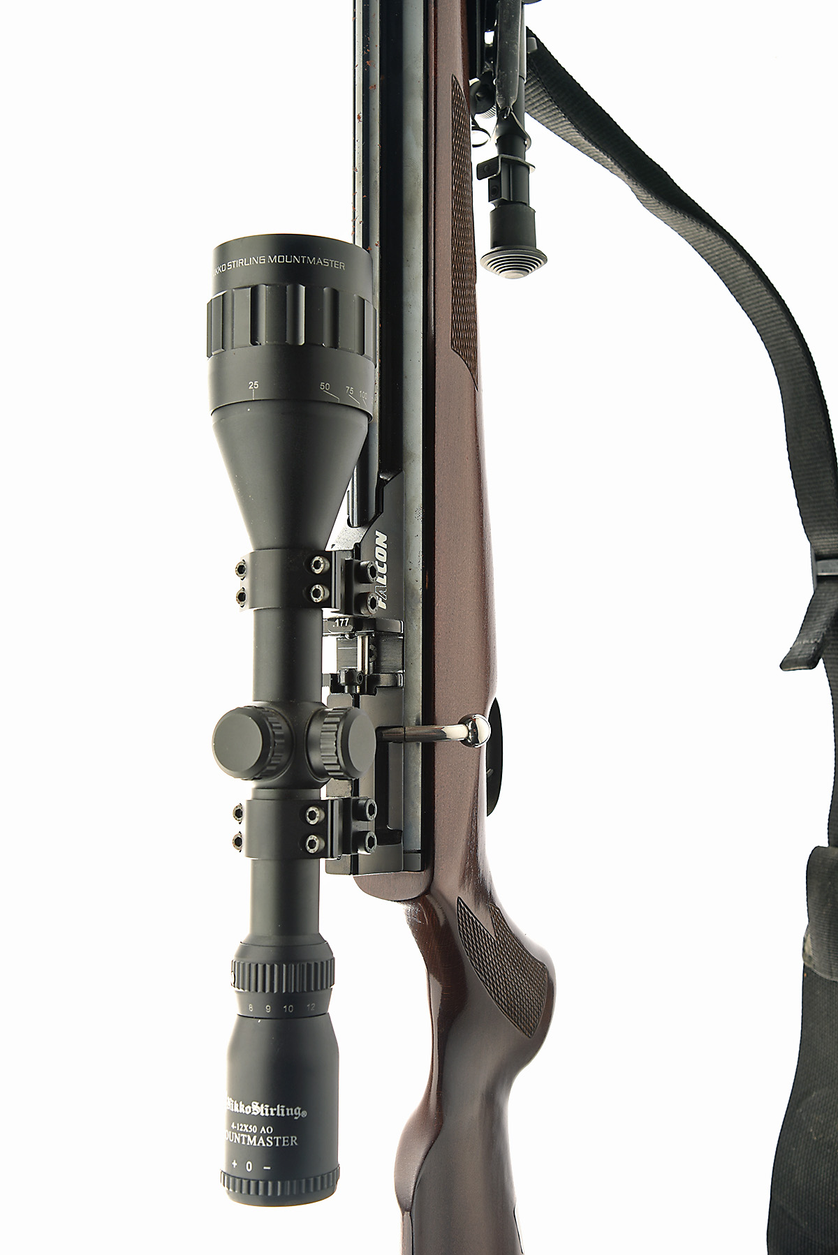 A FALCON .177 PRE-CHARGED PNEUMATIC AIR-RIFLE, serial no. 060332, with 28 1/4in. barrel including detachable sound moderator, bolt action receiver with provision for a magazine (absent), under-barrel air-chamber and beech half-stock, fitted with a Harris-style bipod and a Nikko Sterling 4-12x50 telescopic sight and sling, untested, some surface corrosion spots