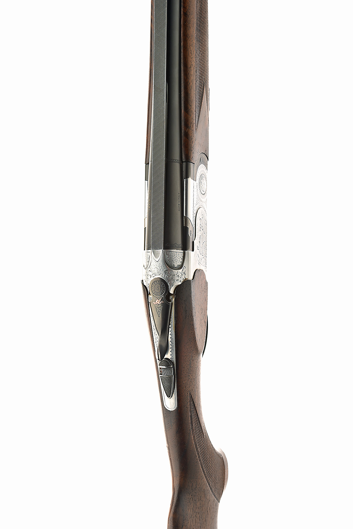 P. BERETTA 12-BORE 'S687' SINGLE-TRIGGER OVER AND UNDER EJECTOR, serial no. L16370B, dated 1992, 31 3/4in. nitro barrels with ventilated mid-rib and 10mm ventilated matt top-rib, 2 3/4in. chambers, multichokes (no spares), hold-open toplever, manual safety with integral barrel selector switch, gold-washed single trigger, borer and partial scroll engraving with game scenes, silver finish, 14 1/4in. pistolgrip stock including 5/8in. rubber recoil pad, weight 8lb. 1oz.