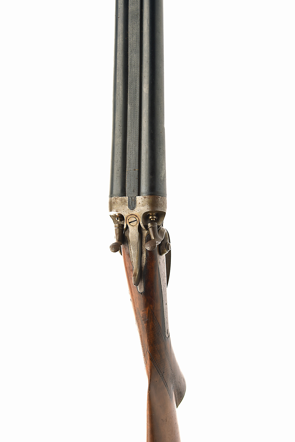 BELGIAN 12-BORE TOPLEVER HAMMERGUN, serial no. 11098, circa 1920, 32in. nitro barrels, 2 1/2in. chambers, bored approx. imp. cyl. choke in both, 13 3/4in. pistolgrip stock, triggerguard loose