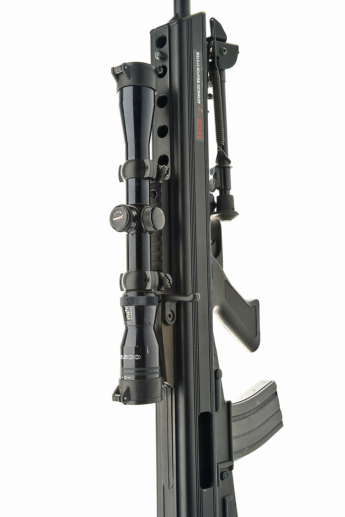 IBUS - BUSHMASTER FIREARMS INTERNATIONAL .223-5.56mm 'MOD. M17S' STRAIGHT-PULL BULLPUP RIFLE, serial no. P04435, circa 1997, 20in. nitro reproved barrel (in 2024), including flash hider, extruded 7075-T6 aluminium receiver fitted with a Tasco 3-12x32 telescopic sight, manual push-button safety, detachable AR-15 magazine (with one spare), polymer pistolgrip, the fore-end fitted with a folding Harris SL bipod, 16 1/4in. pull, in its makers slip with 2 magazine loaders and a plunger
