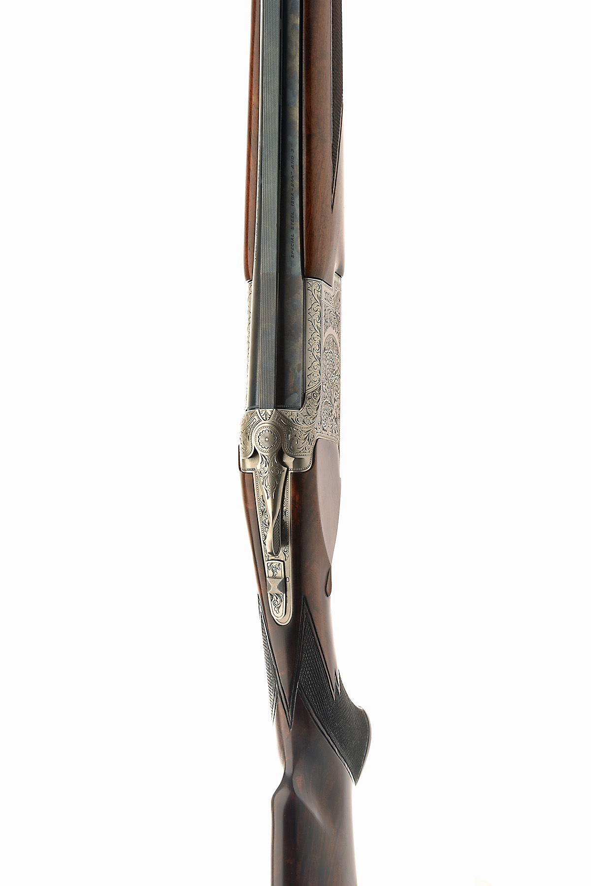 for 2015, 32in. nitro barrels with 8mm ventilated matt top-rib, 3in. chambers, bored approx. 1/2 choke in both, hold-open toplever, automatic safety with integral barrel selector switch, beaded border engraving with bold stylised acanthus scrollwork, old silver finish, 14 7/8in. highly-figured pistolgrip stock (cracked at hand), weight 8lb. 3oz.