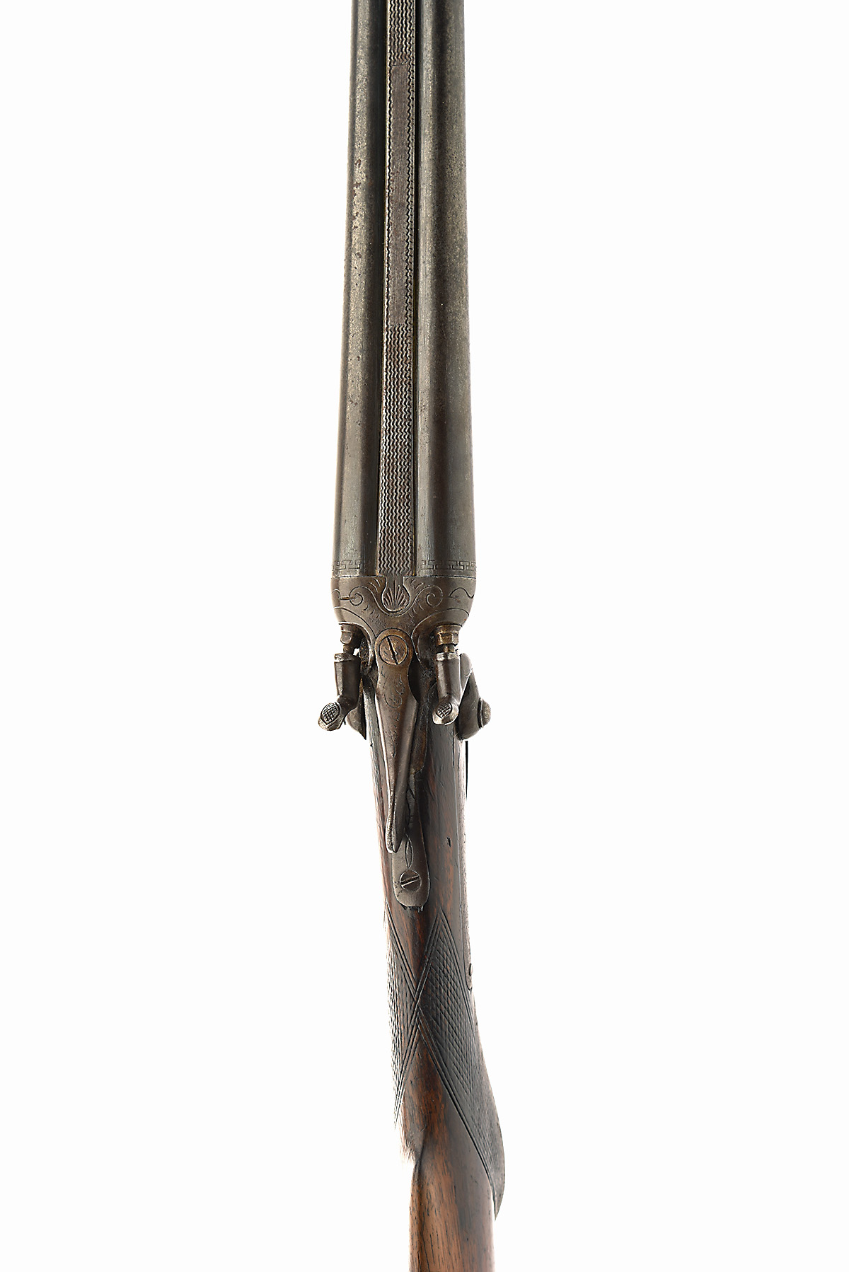 BELGIAN .410 (2IN.) TOPLEVER HAMMERGUN, serial no. 9716, circa 1920, 29 3/4in. black powder only barrels (loose, pitted), 2in. chambers, bored approx. true cyl. in both, treble-grip action, back-action locks with rebounding hammers, border and partial acanthus scroll engraving, 14in. semi-pistolgrip stock including steel buttplate