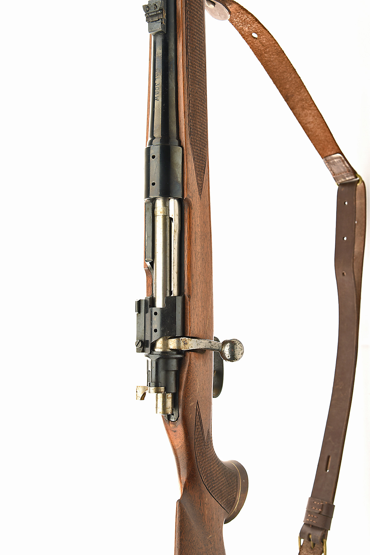 PARKER HALE .308W 'SAFARI SUPER' BOLT-MAGAZINE SPORTING RIFLE, serial no. K308, dated 1963, 22 1/2in. nitro barrel with ramp-mounted bead fore-sight (with cover), flip-up rear-sight, receiver tapped, pistolgrip stock with cheekpiece, leather sling, 13 3/4in. pull including distressed rubber recoil pad