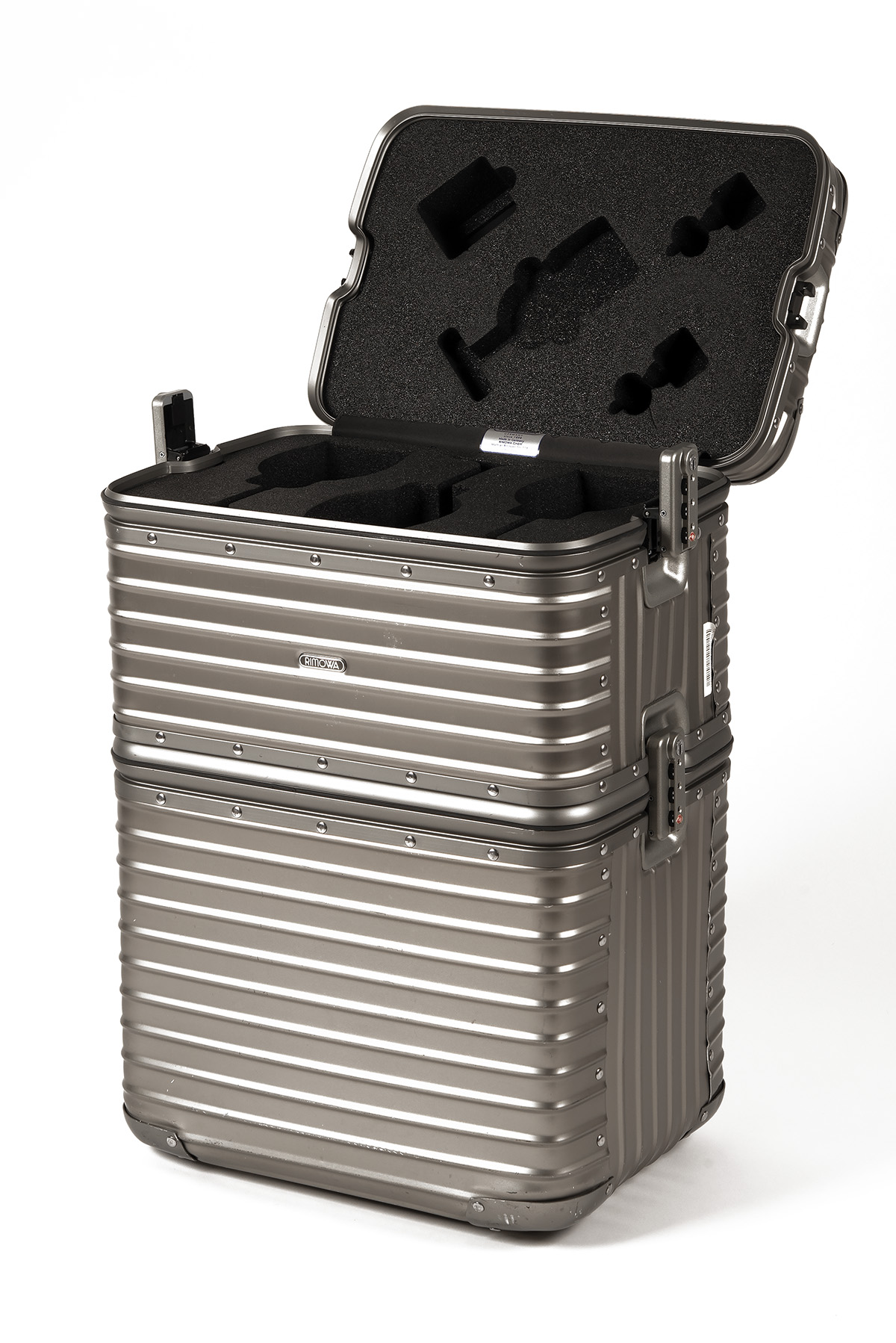 RIMOWA 'GOURMET LINE' TITANIUM WINE CARRY CASE combination locks holds 6 bottles and 3 glasses with removable ice packs dimensions 590 x 350 x 250 mm