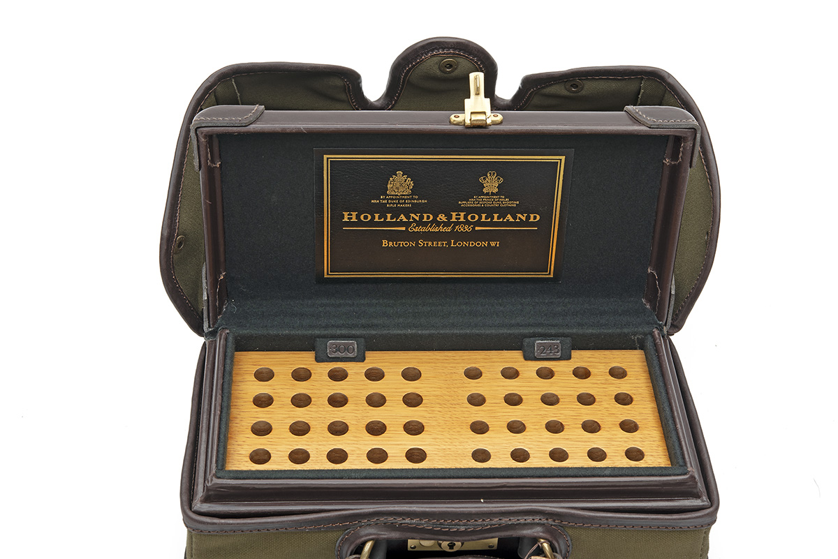 fitted for 25 rounds of .300, 25 rounds of .243, the interior lined with green baize, a leather gold tooled Holland & Holland trade label, brass lock (including key), the lid exterior with the initials 'S.M.B.', with a Holland & Holland green canvas and leather outer