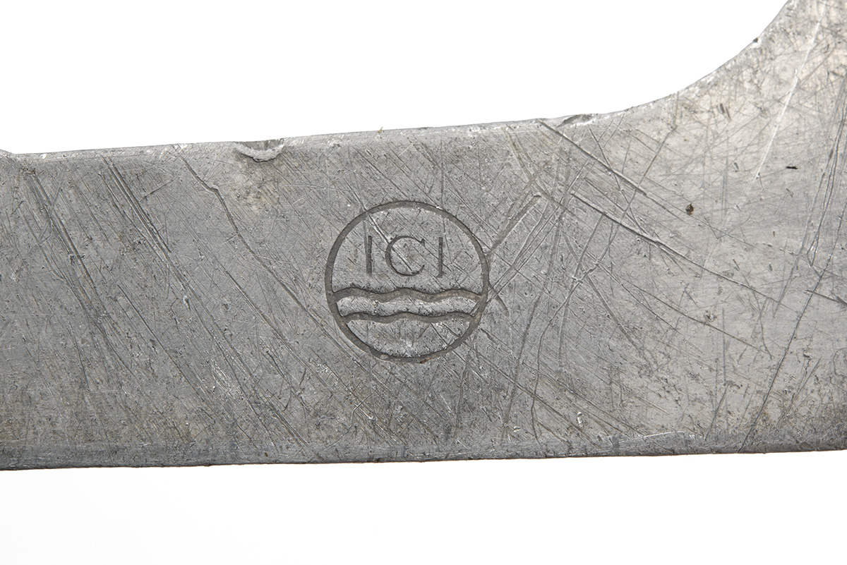 A VINTAGE ICI ALUMINIUM CLAY PIGEON THROWER, complete with two (used) aluminium clay pigeons, 24in. wooden shaft with turned handle, sprung clay reservoir for two clay pigeons, mainplate marked with the 'ICI' logo