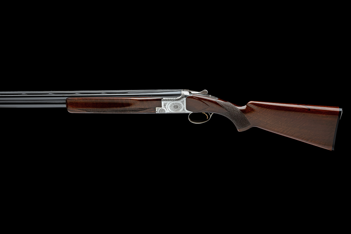 for 1979, 27 1/2in. nitro barrels with 12mm ventilated matt top-rib, 2 3/4in. chambers, bored approx. imp. cyl. and 1/4 choke, hold-open toplever, manual safety with integral barrel selector switch gold-washed single trigger, border and acanthus scroll engraving surrounding a central floral bouquet, brushed finish, 14 1/4in. pistolgrip stock including buttplate, weight 7lb. 5oz.
