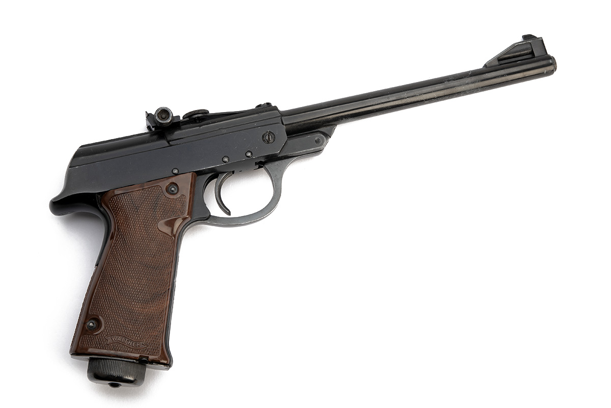 A BOXED EARLY SMOOTH-FINISH WALTHER LP53 .177 AIR PISTOL, serial no. 016254, with blacked 9 1/2in. sighted barrel (some wear to finish), blued smooth-finished receiver, mottled brown chequered grips and in its maker's card carton (worn) with cocking aid, sighting elements, cleaning rod and targets
