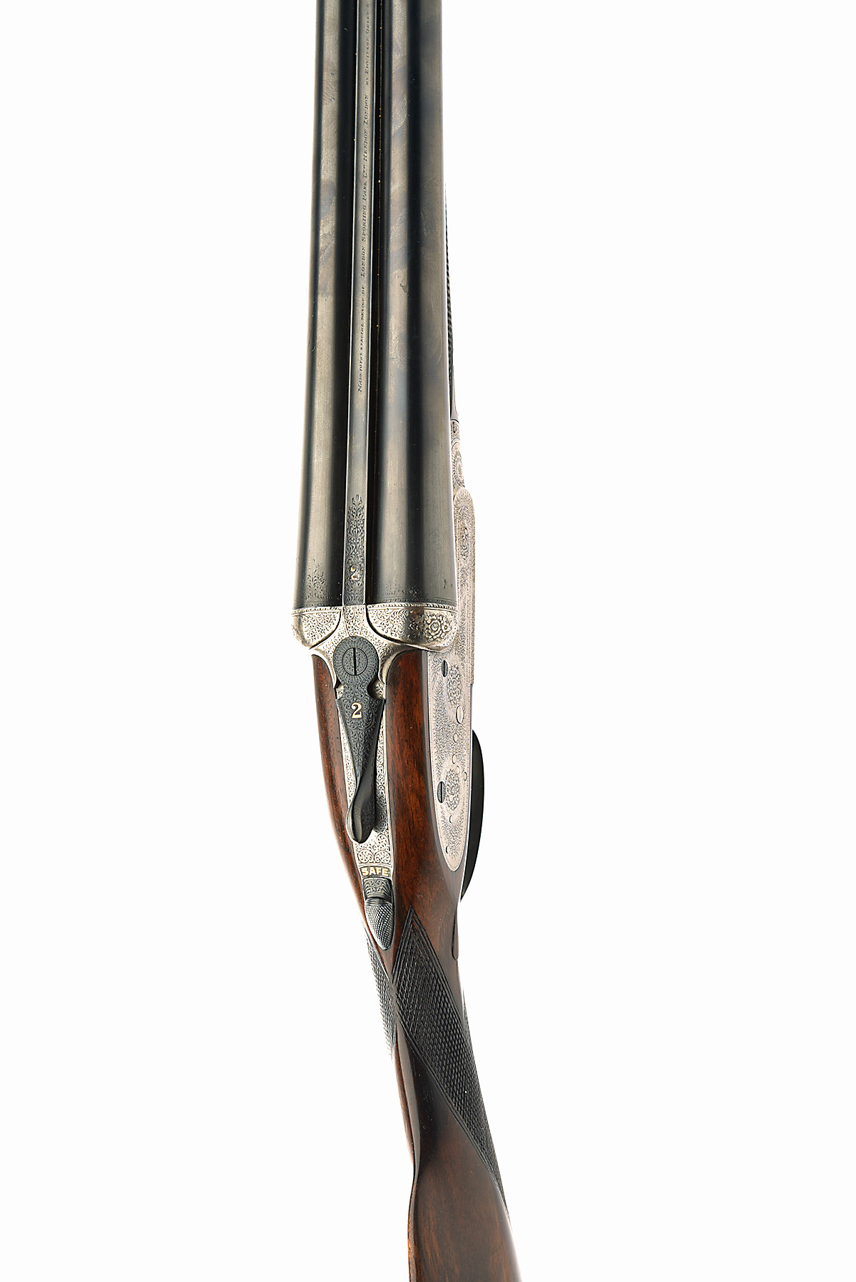 EDWINSON GREEN & SONS FOR LONDON SPORTING PARK 16-BORE ASSISTED-OPENING SIDELOCK EJECTOR, serial no. 431, circa 1915, 28in. sleeved nitro barrels, rib engraved 'MADE TO THE SPECIAL DESIGN OF LONDON SPORTING PARK LTD. HENDON LONDON. BY EDWINSON GREEN & SONS' and gold-inlaid '2' at the breech end, 2 1/2in. chambers, bored approx. imp. cyl. and 1/2 choke, right wall at 20-, ejectors require attention, toplever gold-inlaid '2', automatic safety with gold-inlaid 'SAFE' detail, border and acanthus scroll engraving with floral bouquets, bright finish, 14in. figured stock with diminutive inlet leather cheekpiece, weight 6lb. 4oz., in a fleece-lined leather slip