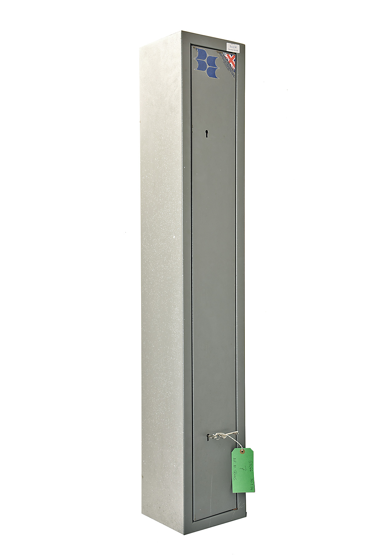 A BRATTONSOUND ENGINEERING BRITISH APPROVED STEEL GUN CABINET, fitted for three guns, measuring approx. 52in. x 9in. x 8in., including keys