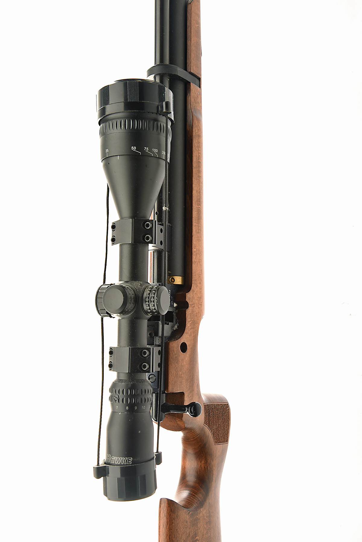 A .22 AIR-ARMS S200 MK3 PRE-CHARGED PNEUMATIC AIR-RIFLE, serial no. A515341, with blued 25 3/4in. barrel including sound moderator, bolt action receiver with 10-shot magazine adaptor (magazine absent), under-barrel air reservoir and beech half-stock, untested, fitted with a Hawke 4-12x50 telescopic sight