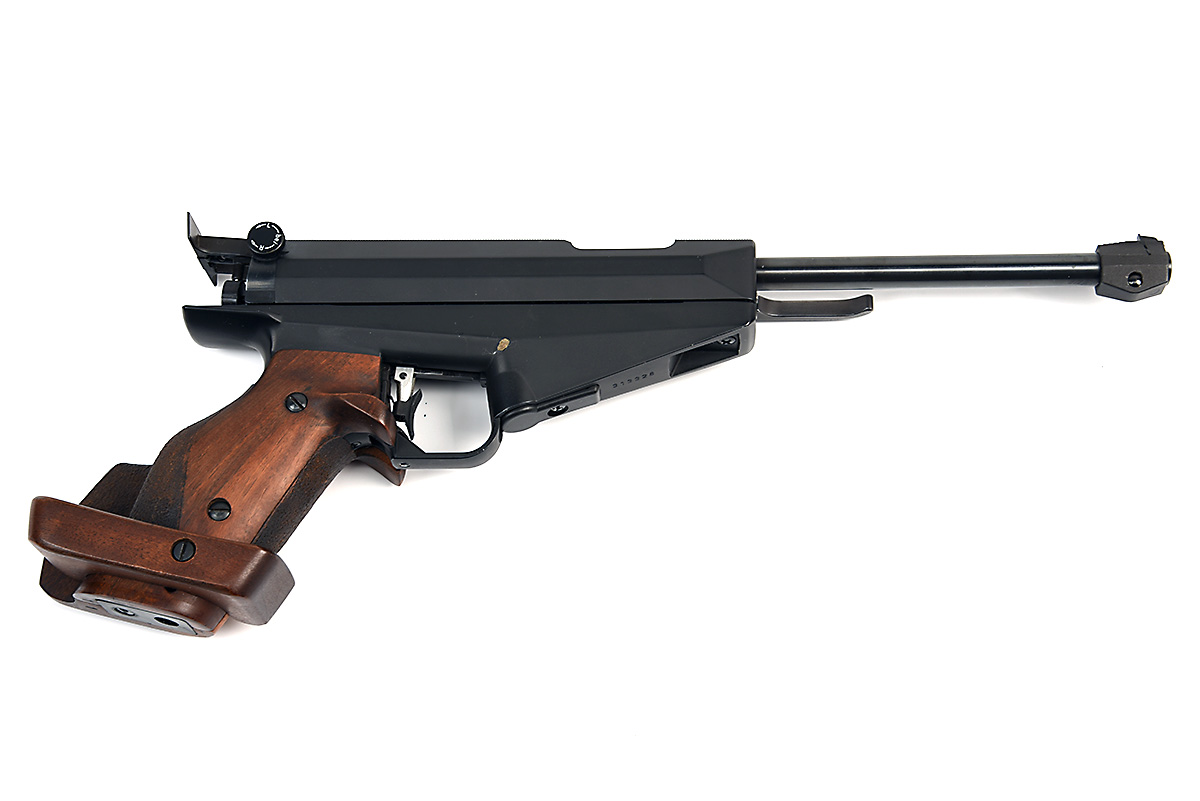 A CASED .177 FEINWERKBAU MODEL 90 RECOILLESS MATCH AIR-PISTOL WITH ELECTRIC TRIGGER, serial no. 313328, with sighted 7 1/4in. barrel, sliding breech, side-lever cocking (currently cocked), blacked receiver and anatomical right hand walnut grip, in its maker's vinyl-covered case with barrel weights, untested