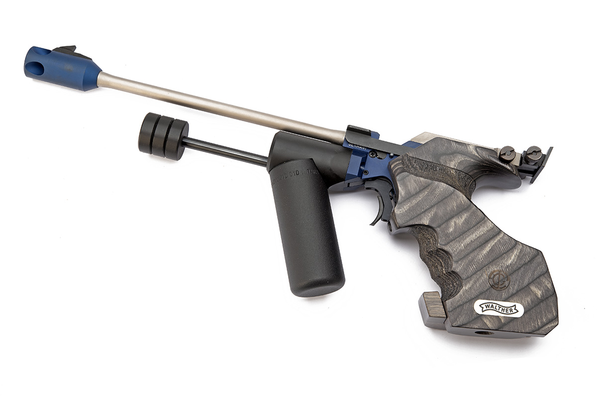 A CASED .177 WALTHER CPM1 MATCH CO2-POWERED AIR-PISTOL, serial no. 16431, with floating satin finished 10 1/2in. barrel including contrasting blue muzzle-break, blue finished lever-cocking receiver, stippled grey laminated right-hand grip and underslung reservoir, in its maker's abs plastic carry case with spare cylinder, tools and instructions, appearing little used (tested)