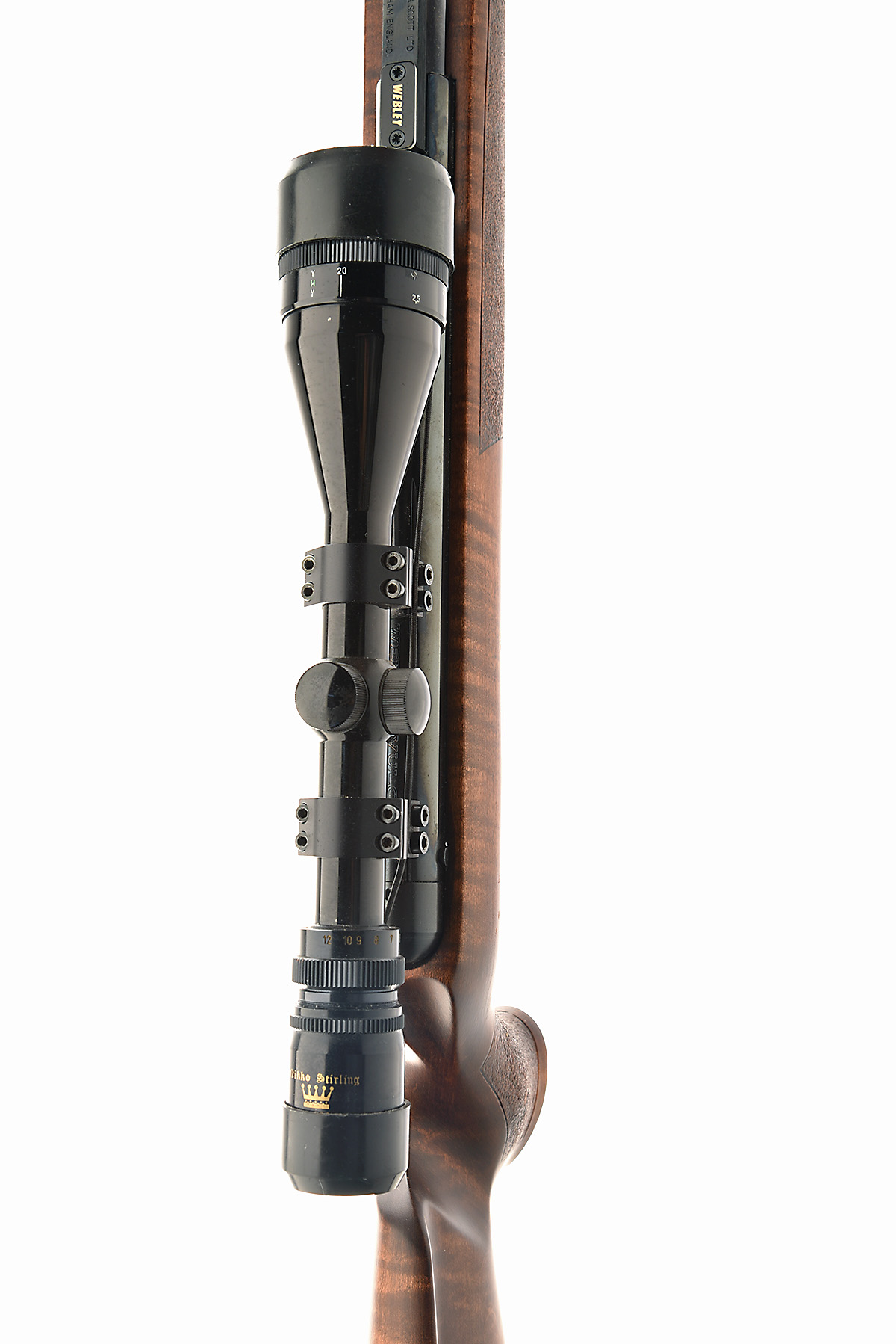 A SCARCE .177 & .22 SANDWELL FIELDSPORTS CUSTOM WEBLEY & SCOTT VULCAN AIR-RIFLE, serial no's 875413 & 865812, the .177 barrel measuring 17in. and the .22 barrel 13 1/4in, both including built-on sound moderators, finely reblued air-chamber still bearing the SFS decal, custom beech right-hand sporter stock with stippled grip panels and fitted with swivels for sling, some marks to wood but generally collector's condition and fitted with a Nikko Sterling 4-12x50 telescopic sight
