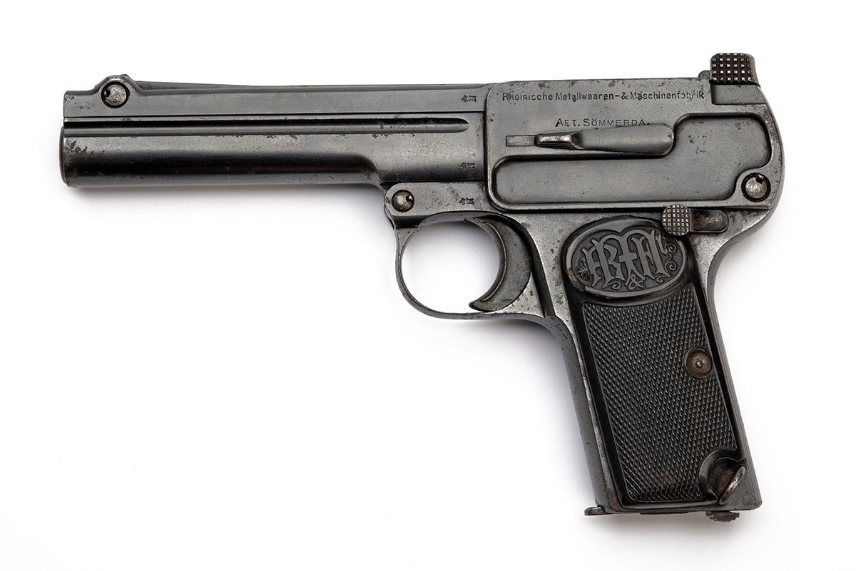 circa 1915, with 5 1/4in. barrel concealed within the lower half of receiver, direct blow-back mechanism, the top of receiver unlocking and hinging to bypass recoil spring, side ejection port, milled panels above the blued frame, chequered hard rubber grips, the tops embossed with the 'R.M.F.' monogram for Rheinische Metallwaaren & Maschinenfabrik (small amount of worm to right hand grip), detachable magazine (with the serial number, the pistol itself not numbered) and lanyard ring at heel, much original finish remaining