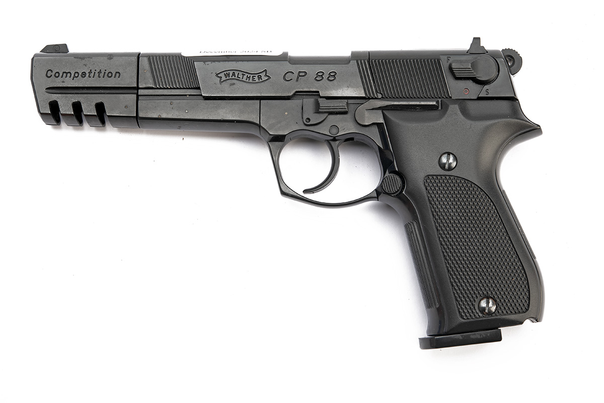 A CASED .177 UMAREX WALTHER CP88 CO2-POWERED AIR-PISTOL, serial no. A071253863, with blacked 6in. barrel including built-on muzzle weight, fixed sights, blacked frame and black plastic chequered grips, in its maker's abs plastic carry case with accessories, untested