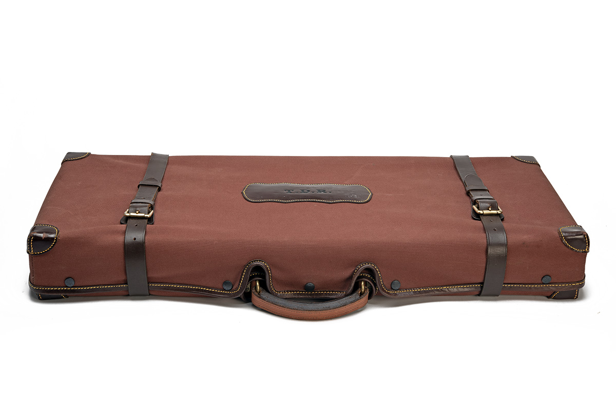 fitted for 29in. barrels, the interior re-lined with maroon baize, the lid interior with gold-tooled James Purdey trade label and charge label for gun numbers 25113 / 4, leather fixing straps, brass lock (no key), canvas and leather outer, the lid and outer embossed 'T.D.R.'