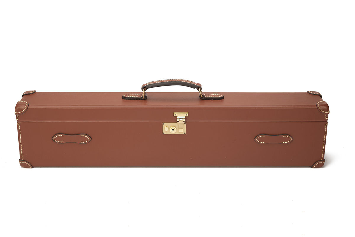 fitted for 31in. barrels, the interior lined with maroon baize, leather fixing straps (unfitted), brass lock (with key), the whole appearing unused