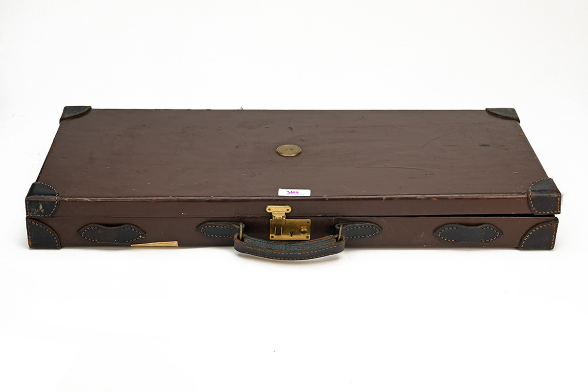 A LEATHER DOUBLE GUNCASE, fitted for 27 1/2in. (70cm) barrels, the interior lined with maroon baize, brass lock, missing its fixing straps