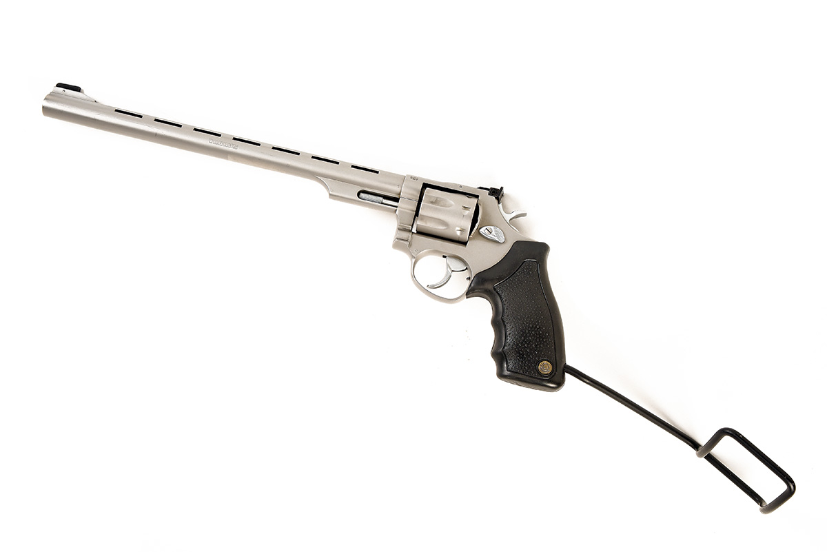 A STAINLESS .22 (L/R) TAURUS LONG BARRELLED REVOLVER, serial no. BU661002, with 12in. barrel, ventilated sighting rib, solid frame with swing-out seven shot fluted cylinder, soft rubber stippled finger-grooved grip and permanent rear-mounted wrist brace to comply with UK law, in a nylon zip-up rug