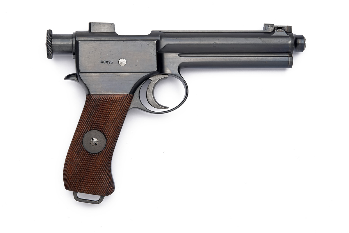 military marks for 1910, with 5 1/2in. concealed barrel, flat sighting rib signed 'WAFFENFABRIK STEYR' and fitted with a dove-tailed fore-sight, fixed rear-sight, blued receiver with cocking piece to rear and moulded charger guide, blued frame with internal magazine and solid lanyard loop to heel, semi double-action trigger and grooved walnut grips, the right grip with a vacant steel roundel, the whole appearing in unissued condition with virtually all its factory blued finish remaining