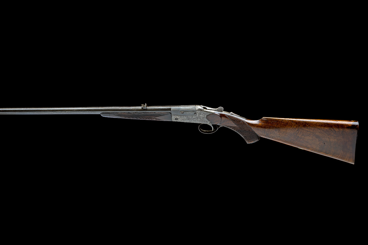 for 1902, with reblued ovoid 26in. barrel, machine-engraved sighting flat with dove-tailed fore-sight and standing notch rear-sight with two additional folding leaves, border and scroll engraved breech-end, automatic ejection on opening, border and scroll engraved boxlock hammerless action with toplever opening, top-tang safety, walnut butt-stock with chequered and capped pistol-grip, truncated cone head, ribbed heel, guarded trigger and chequered walnut splinter snap-on fore-end with horn tip