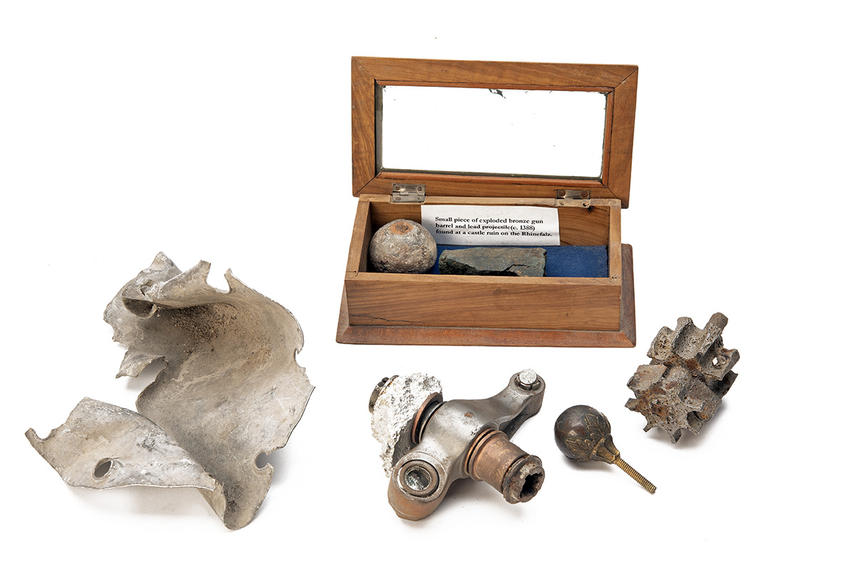 A MIXED GROUP MILITARIA, wide range of items and periods, including a German Waffenamt-marked magazine loader for the MG13 machine gun; an apparently unused reproduction holster for the P08 Luger; a swagger-stick for the Artists Rifles, a repro 'slim Jim' revolver holster; an instructor's prism sight for a No. 1 Mk III SMLE; a spike bayonet for the SMLE; a reproduction dagger; WWII aircraft relics (no provenance); two relics purporting to come from a castle ruin in the Rhinepfalz, etc., mixed conditions