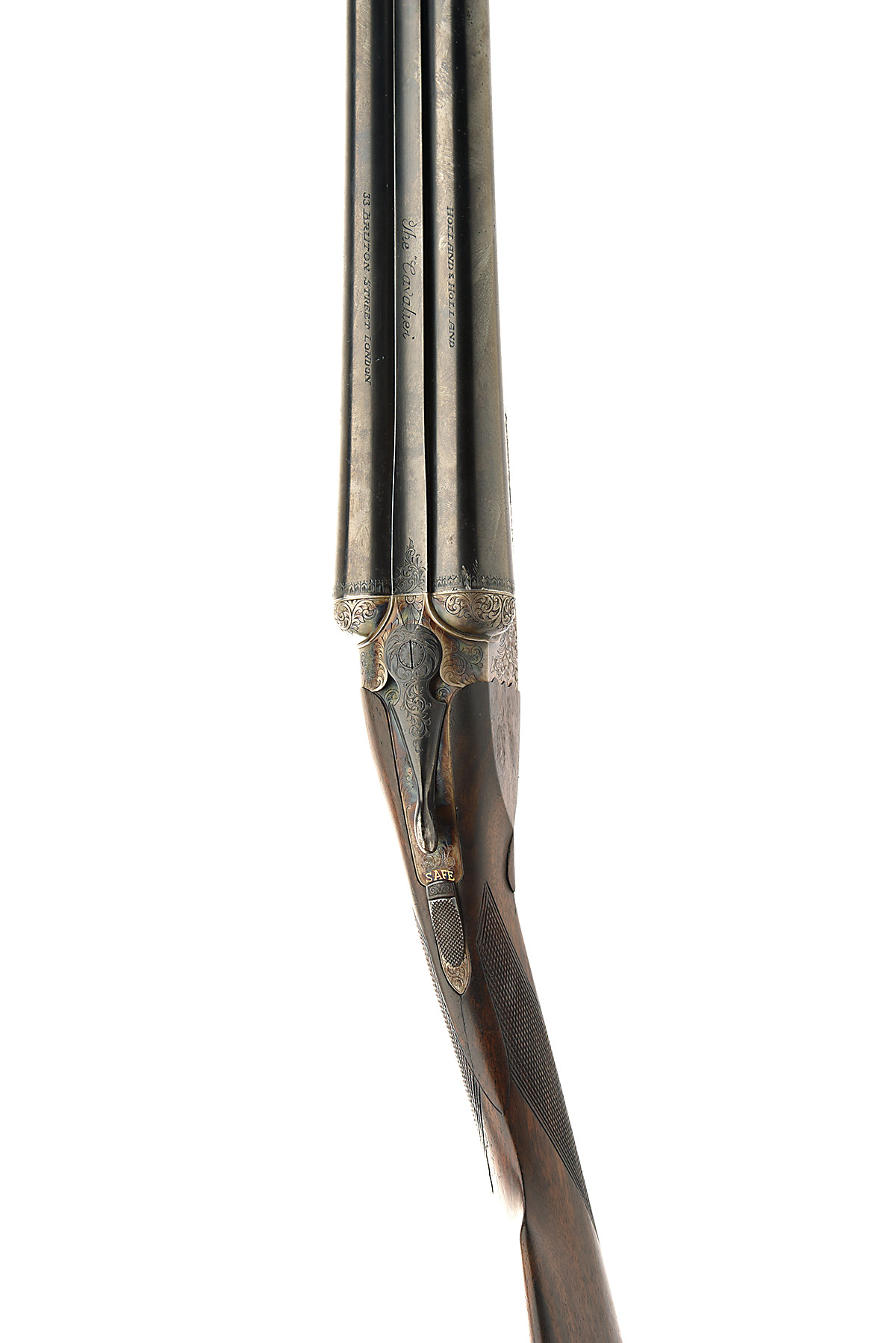 HOLLAND & HOLLAND 12-BORE (CENTRAL VISION) 'THE CAVALIER' BOXLOCK EJECTOR, serial no. 50159, circa 1989, 28in. nitro chopperlump barrels, the rib engraved in script 'The Cavalier', the tubes engraved 'HOLLAND & HOLLAND 33 BRUTON STREET LONDON', 2 3/4in. chambers, bored approx. imp. cyl. and 1/2 choke, scroll-back action, automatic safety with gold-inlaid 'SAFE' detail, rolled-edge triggerguard, bold acanthus scroll engraving with matted detailing, the makers name in scrolling banners to the sides, the underside with 'THE "CAVALIER"', retaining traces of original colour-hardening and finish, 14 3/4in. stock (cast for central vision, cracked at hand), weight 6lb. 10oz.