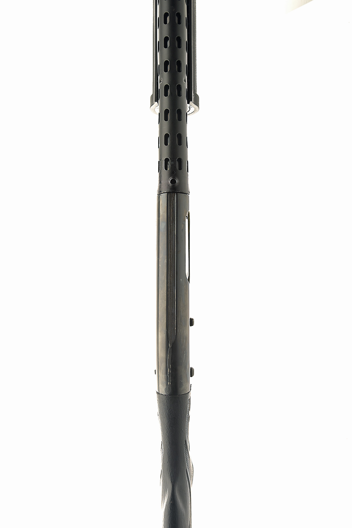 AN F.A.C. REMINGTON 12-BORE 'WINGMASTER MODEL 870' PUMP-ACTION SHOTGUN, serial no. V422861V, for 1983, extended tubular magazine, 28in. nitro reproved ribless barrel (in 2024), fitted with a heat shield, 3in. chamber, bored approx. 1/2 choke, manual push-button safety, 13 1/4in. ornately chequered pistolgrip stock including rubber recoil pad, the right side with inset cartridge holder, the whole in matt black finish