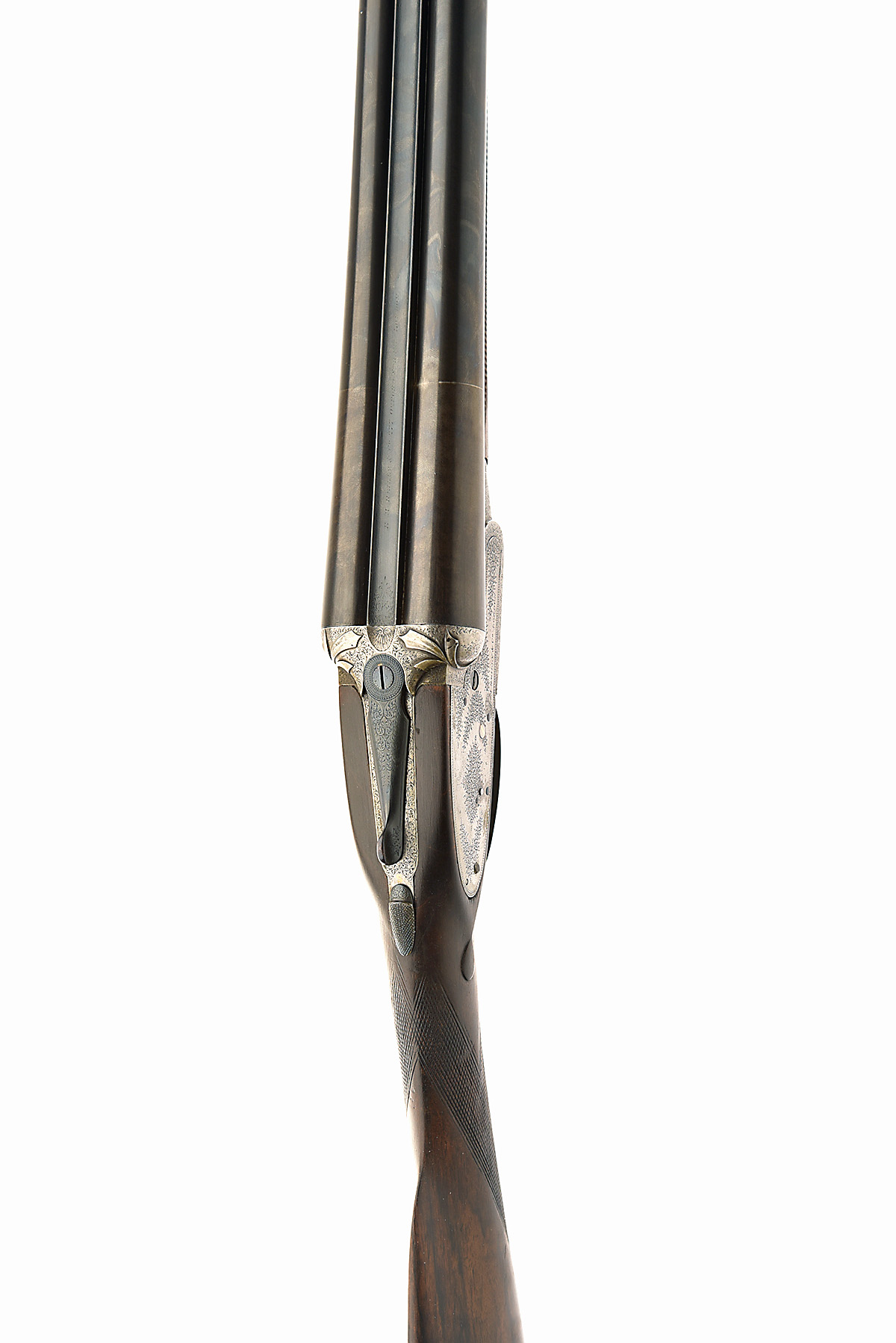 E.M. REILLY & CO. 12-BORE SIDELOCK EJECTOR, serial no. 33923, circa 1880, 28in. sleeved steel to damascus nitro barrels, 2 1/2in. chambers, bored approx. 1/4 and full choke, carved stylised acanthus fences, automatic safety with gold-inlaid 'S' detail, beaded border and partial acanthus scroll engraving, brushed finish, 14 1/2in. figured stock including 1in. extension, weight 7lb. 2oz.