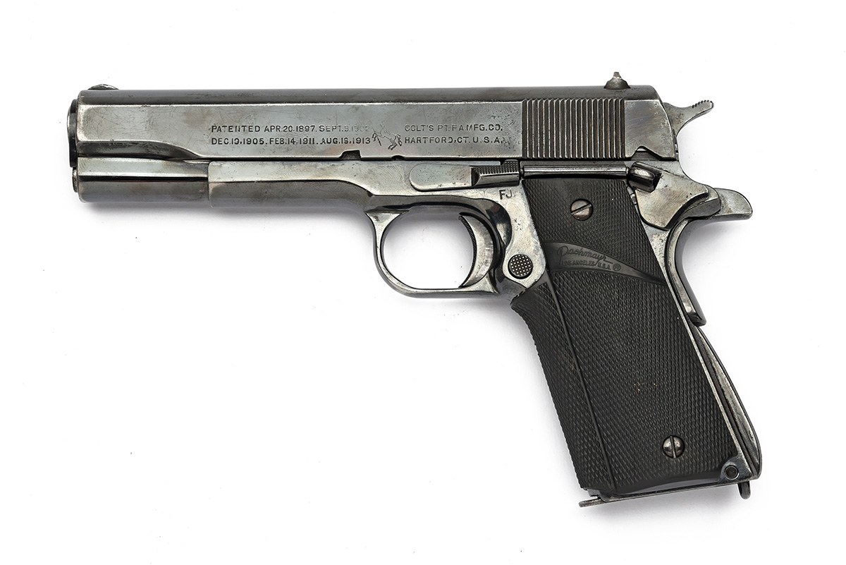 ** A COLT .45 (ACP) MODEL 1911A1 SEMI-AUTOMATIC PISTOL, serial no. 1961662, for 1944, with 5in. barrel, reblued slide and frame, arched mainspring housing and chequered rubber Pachmayr grips
